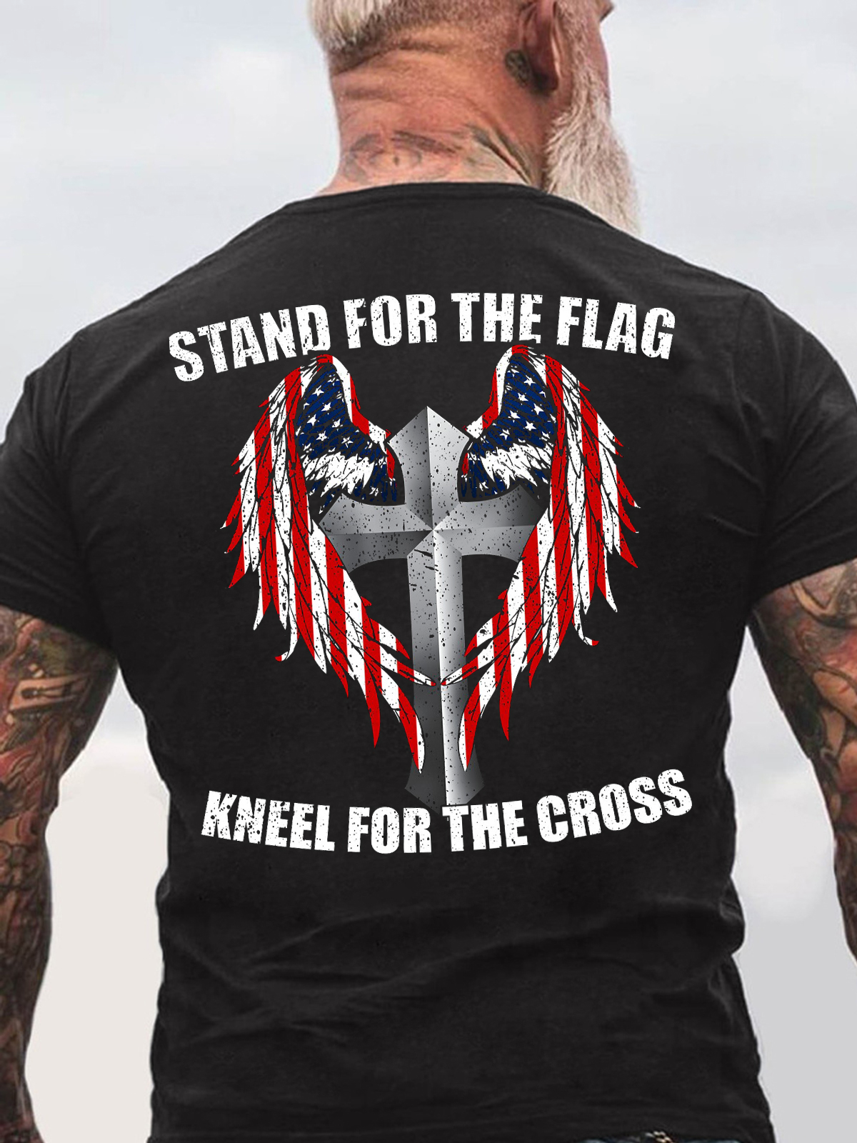 Men's Stand For The Flag Kneel For The Cross Funny Graphic Printing Casual Text Letters Cotton Crew Neck T-Shirt